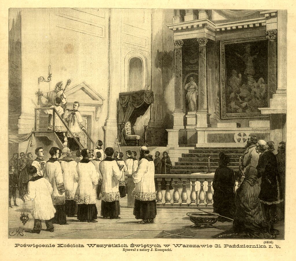 Na zdjęciu: Poświęcenie kościoła Wszystkich Świętych wg rysunku J.Konopackiego, zamieszczonego na stronie tytułowej „Czasopisma Ilustrowanego Tygodniowego Kłosy”, nr 959, Warszawa 3 (15) listopada 1883 r.