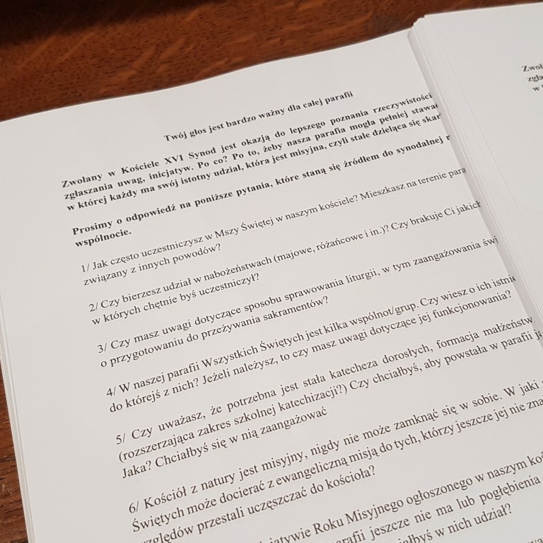 W październiku minionego roku rozpoczęliśmy w Kościele Synod, podczas którego mamy przyjrzeć się temu, w jaki sposób razem, duchowni i świeccy, budujemy wspólnotę Kościoła, począwszy od parafii. Dlatego rozpoczynając rozmowę na forum całej naszej wspólnoty zaczynamy od ankiety, którą można zabrać do domu, wypełnić przynieść do kościoła i wrzucić do specjalnie przygotowanej skrzynki. W późniejszym terminie przewidujemy także spotkania, podczas których będzie można porozmawiać o dalszym funkcjonowaniu naszej wspólnoty, zgłaszając swoje uwagi i pomysły.
